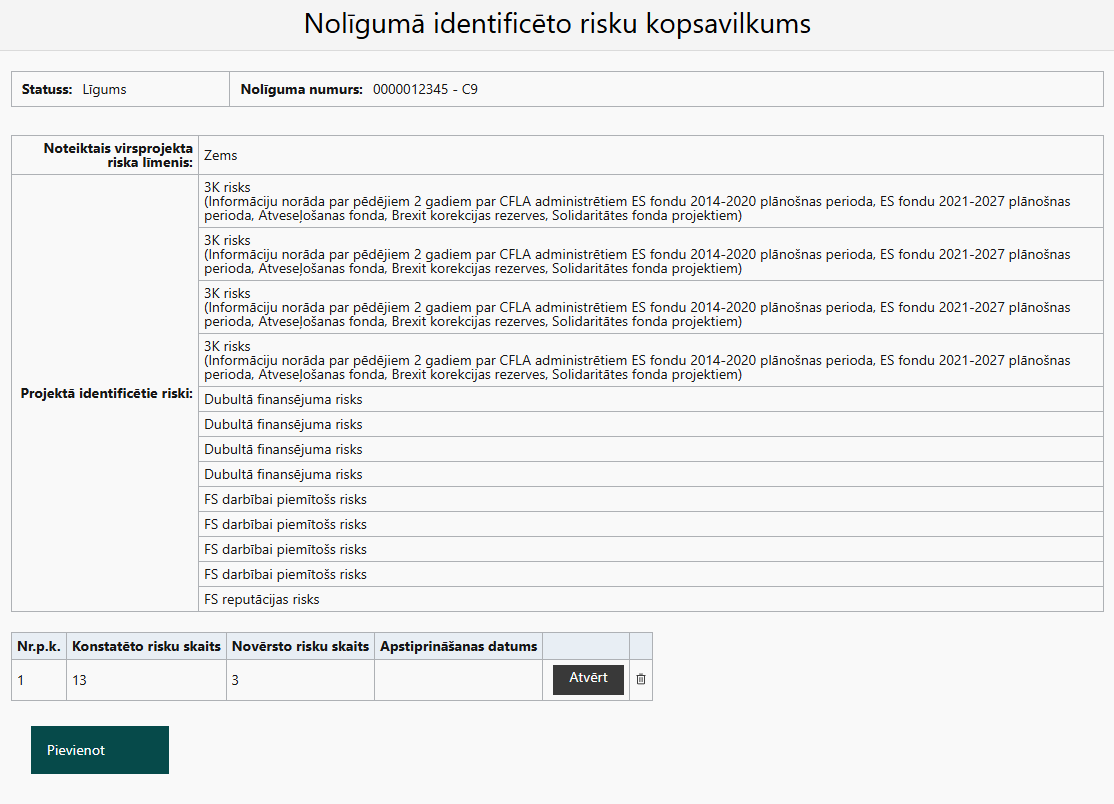 Nolīgumā identificēto risku kopsavilkums