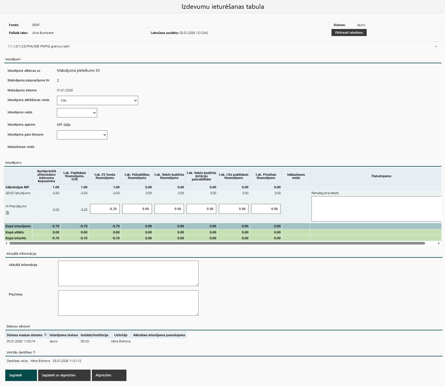 Ieturējuma tabulas ieraksta forma pēc pievienošanas