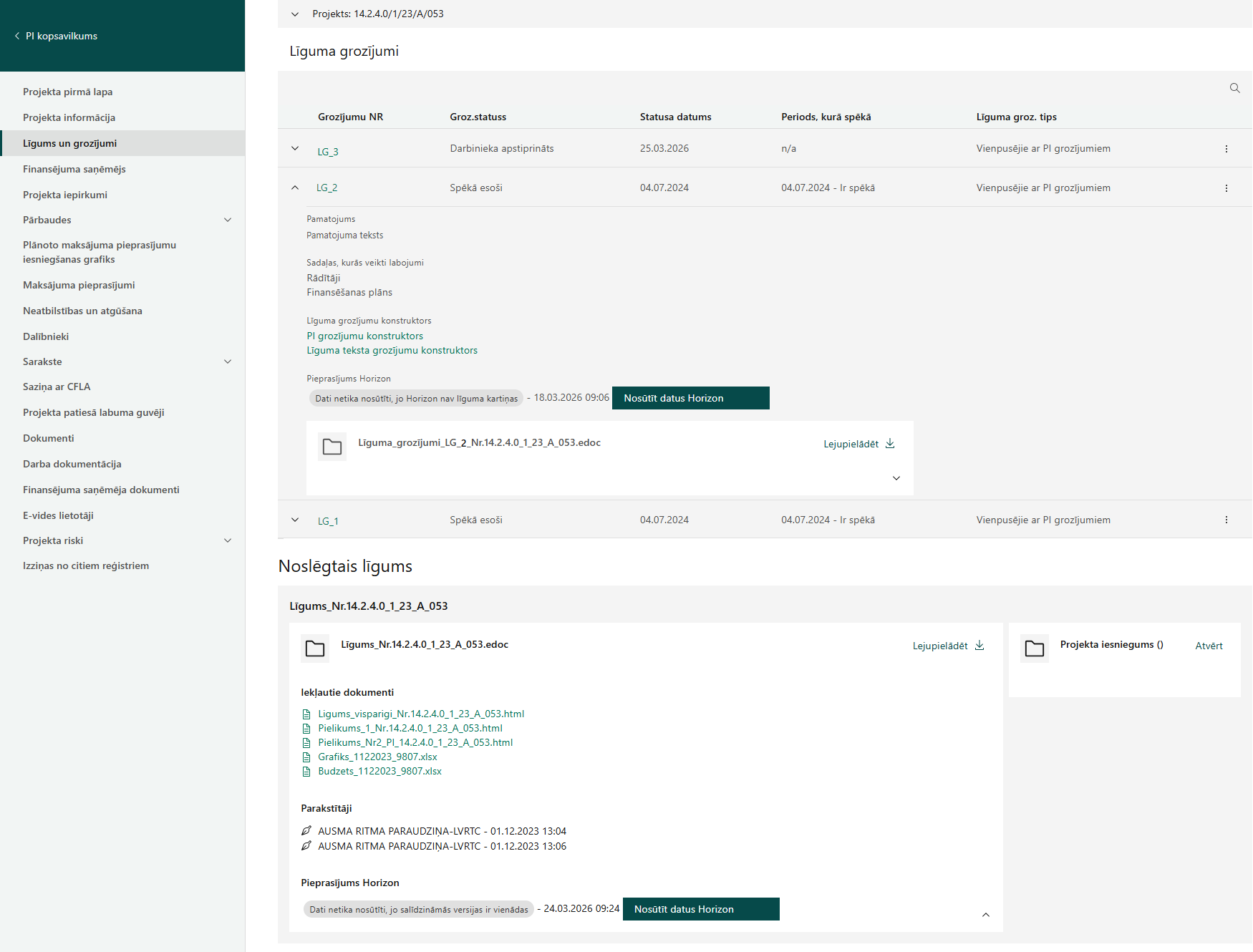 Līgums un grozījumi (projekta statuss Līgums)