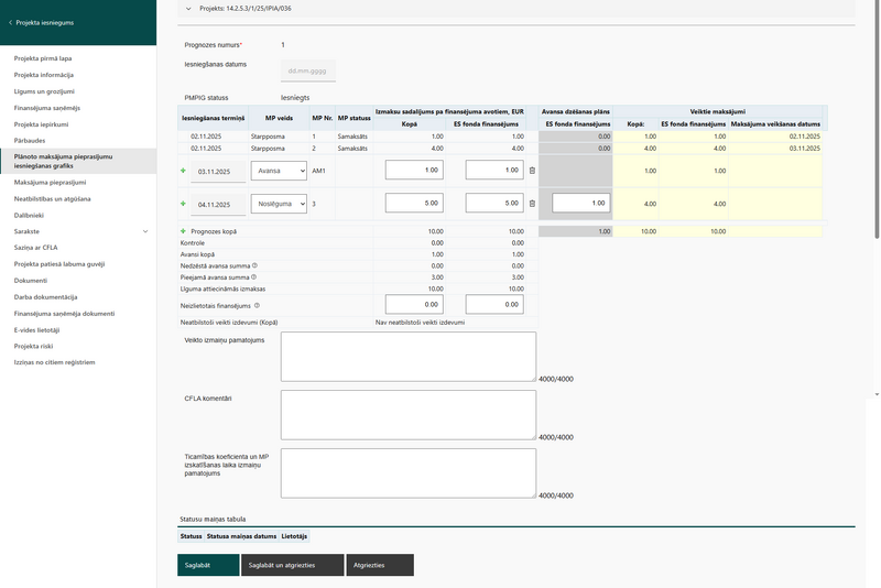 Plānoto maksājumu pieprasījumu iesniegšanas grafika ievades forma