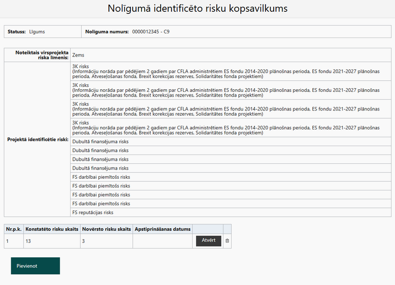 Ar pogu <Pievienot> iespējams pievienot jaunu risku kopsavilkuma izvērtējuma versiju. Pēc kopsavilkuma pievienošanas, tiek attēlota risku tabula.
