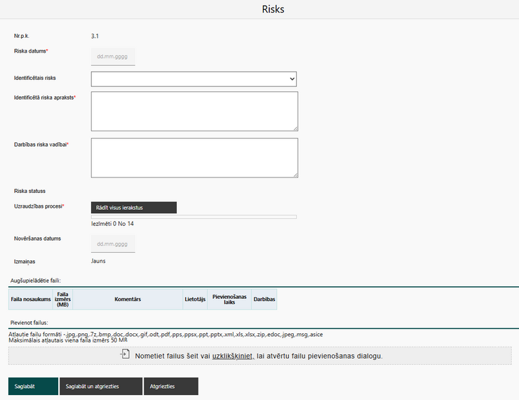Pievienojot jaunu vai atverot riska ieraksta rindu, tiek attēlota forma ar sekojošiem laukiem: