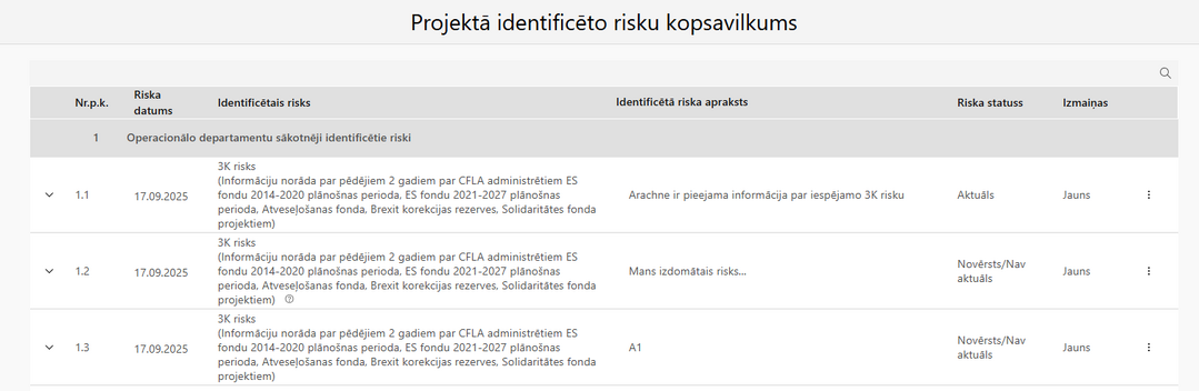 Projektā identificētie riski: | tiek attēlots saraksts ar sadaļas "Sākotnējais izvērtējums" - "Operacionālais departaments" kolonā "Risks" norādītajām vērtībām (pēc virskontroles apstiprināšanas), apvienots ar sadaļas "Risku kopsavilkums" jaunākās apstiprinātās veidlapas 3. apgabalā, "Projekta īstenošanas laikā konstatētie riski" kolonā "Identificētais risks" norādītājām vērtībām (pēc virskontroles apstiprināšanas) |