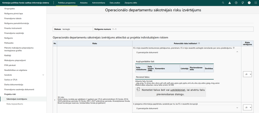 Potenciālā riska indikatori | tiek attēlots potenciālā riska indikatora nosaukums. Dati tiek ielasīti no Administrēšanas sadaļas "Risku izvērtējums" - "Projekta riski" - "Operacionālo departamentu projekta identificētie riski". Lauks nav labojams.