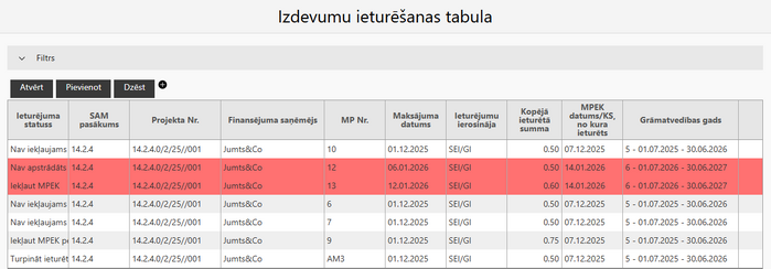 Kolonnā “Pamatojums” tiek norādīts MPEK numurs un datums(izdevumi līdz) vai KS numurs un grāmatvedības gads, kurā ir iekļauts MP ar saiti uz MPEK/KS.