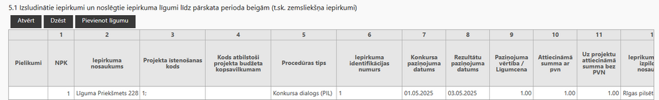 Atverot maksājuma pieprasījuma apakš sadaļu '''"Iepirkumi un līgumi (5.1)"''', tiek attēlota tabula ar informāciju par iepirkumiem un iepirkuma līgumiem. Šajā tabulā jāiekļauj visi izsludināti iepirkumi, t.i., plānotie iepirkuma līgumi, par kuriem pēc līguma noslēgšanas informācija ir jāpapildina/jāaktualizē atbilstošajās kolonnās, kā arī zemsliekšņa iepirkuma līgumi.