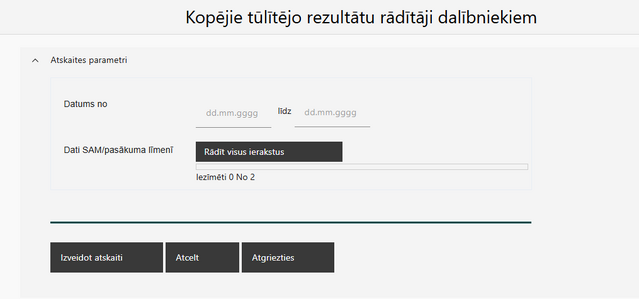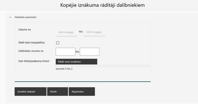 Atverot sadaļu '''"Kopējie iznākuma rādītāji dalībniekiem"''', lietotājam tiek attēlota forma ar atskaites parametriem.