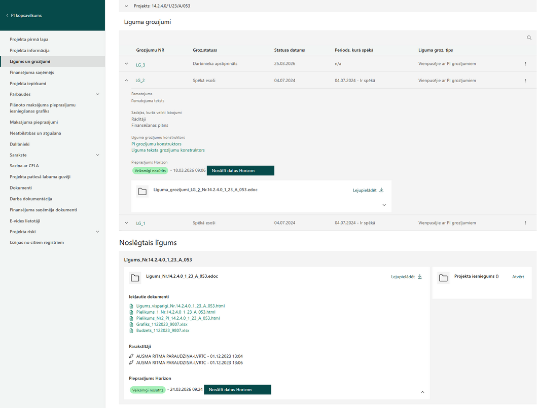 Ja projekts atrodas statusā Līgums (Līgums ir abu pušu parakstīts), tad sadaļā tiek attēlota tabula ar projekta Līguma grozījumiem. Tabulā tiek atspoguļoti visi pie attiecīgā līguma iesniegtie grozījumi – gan FS (sākot ar statusu FS sagatavošanā) gan CFLA ierosinātie (sākuma statuss – CFLA izveidoti grozījumi).
