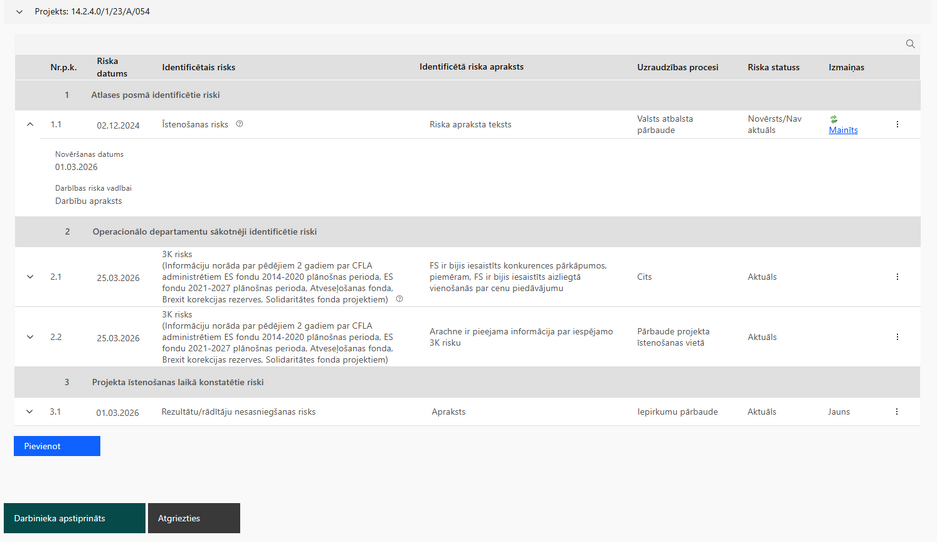 Operacionālo departamentu sākotnēji identificētie riski - tiek attēloti riski, kas ievadīti sākotnējā riska izvērtējuma daļā "Operacionālo departamentu sākotnējais izvērtējums attiecībā uz projekta individuālajiem riskiem" un kolonā "Riska vērtējums" ir vērtība "Jā". Lauks nav labojams Projekta īstenošanas laikā konstatētie riski - izkrītošā saraksta lauks. Vērtības no Administrēšanas sadaļas "Risku izvērtējums" - "Projekta riski" - "Identificētais risks". Lauks ir obligāti aizpildāms