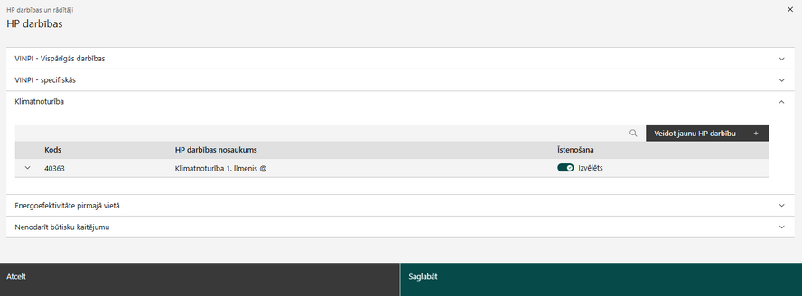 - Darbības un izmaksas (tikai pielāgotām atlasēm, piemēram, 2.2.3.6.);
